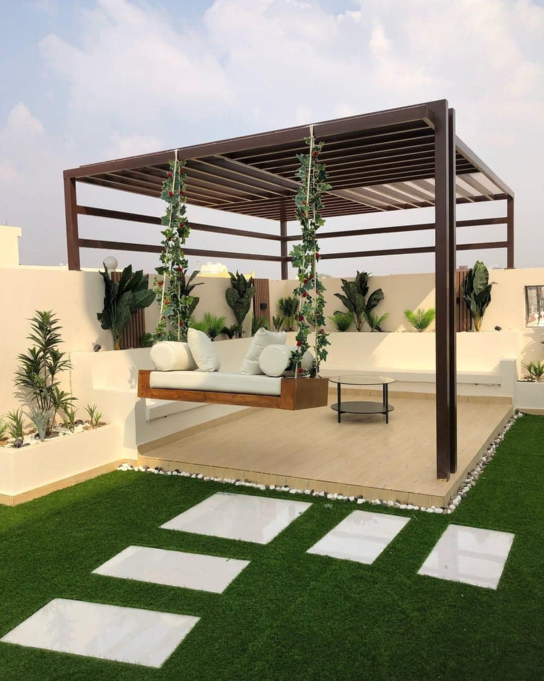 كما ان تصميم الجلسات الخارجية المودرن علي الطريقة اليونانية , فهي تعطي طابع راقي وجميل لسطح المنزل مع الزرع الصناعي والورود والاضاءة المخفية فيمكنك التواصل مع شركة الرحمة لتحصل علي افخم جلسة خارجية لسطح منزلك